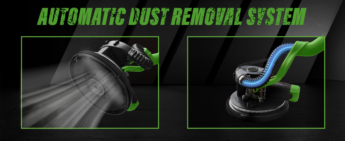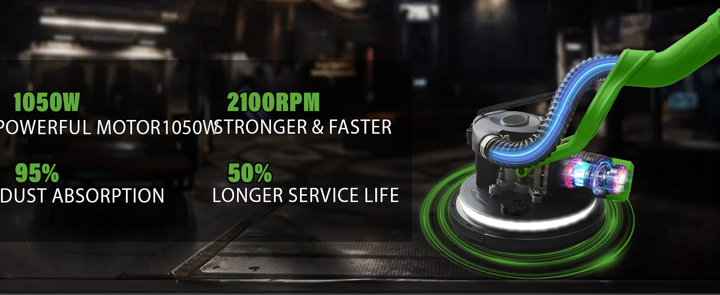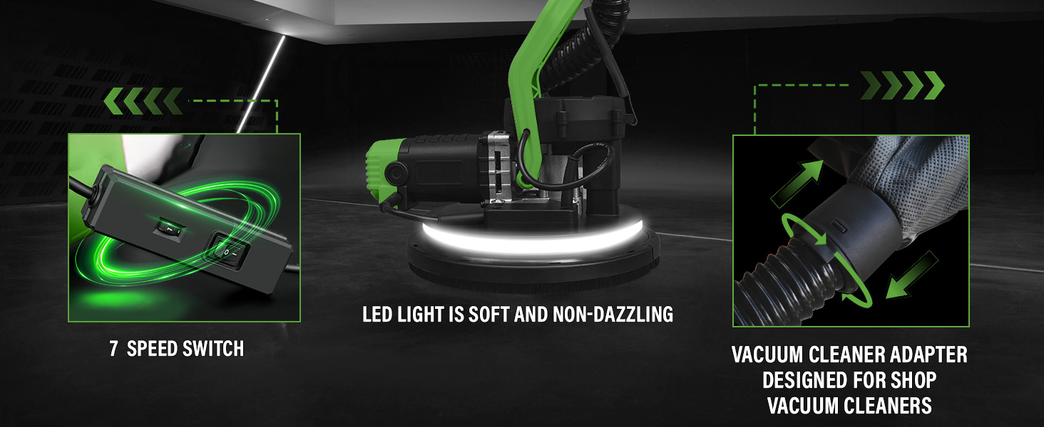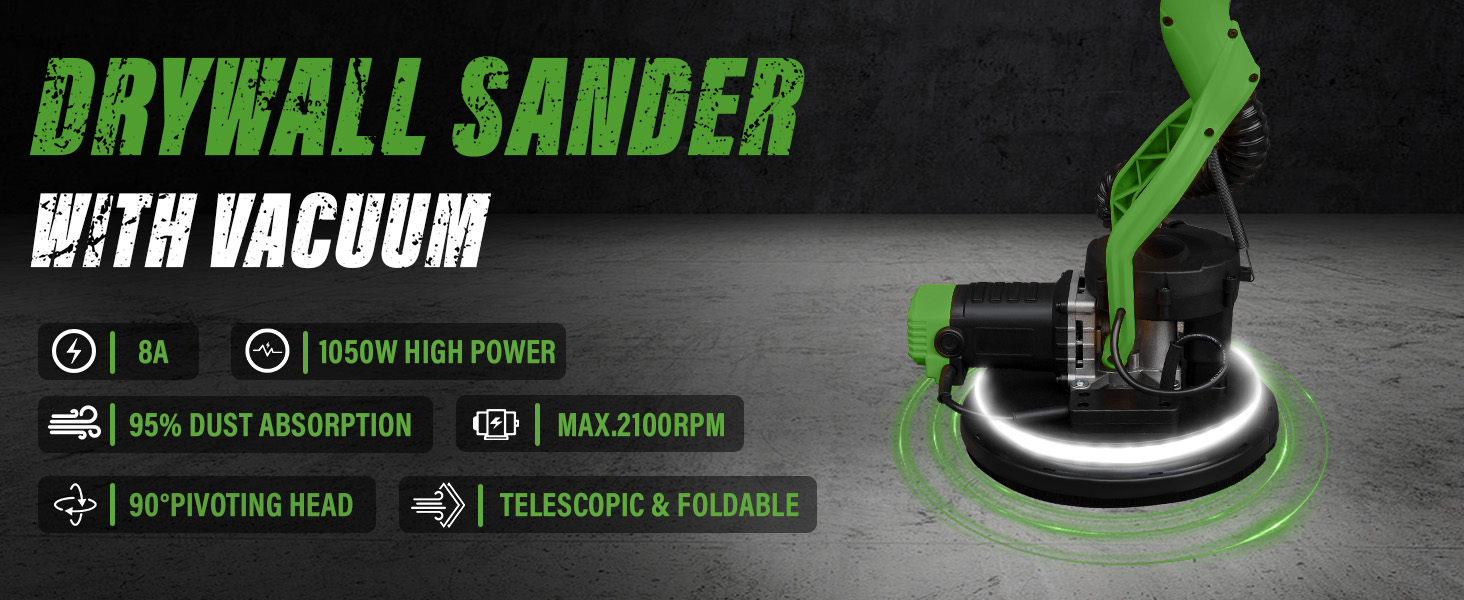 1050W Electric Drywall Sander with Vacuum, LCD Display, 7 Speeds (800–2100RPM), Foldable & Extendable Handle, 12 Sanding Discs, for Walls, Ceilings, Floors (Green)